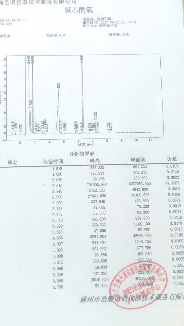 滕州市浩瀚色谱仪器技术服务有限公司,,以科学发展为指导,,,色谱工程研究所,分析与测试中心3个科研单位,研发出HHLYS3698-30氯乙酰氯直接进样分析专用毛细管柱,测定了氯乙酰氯,二氯乙酰氯,三氯乙酰氯含量,结果满意。
